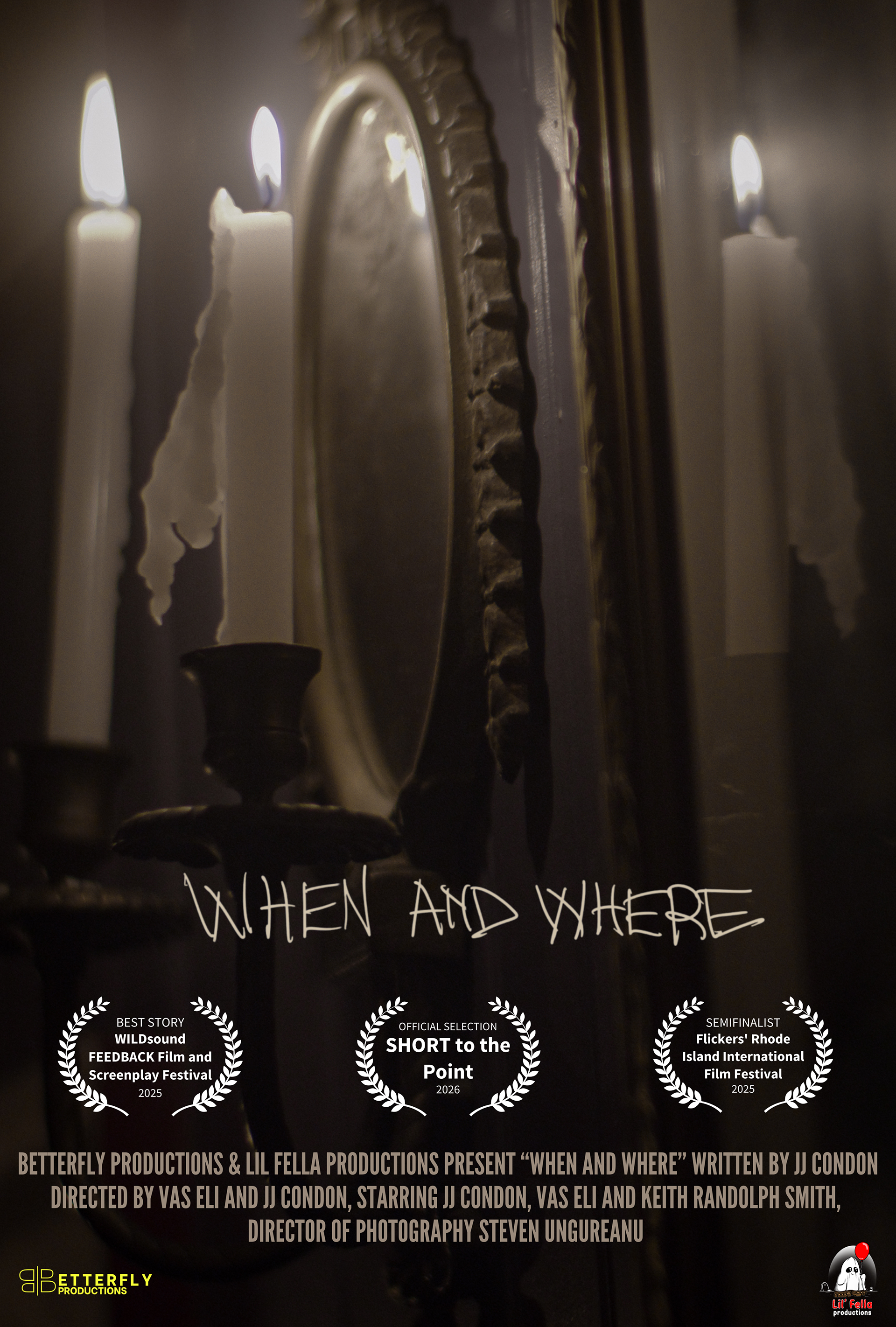 When & Where is a near-future short film written, directed, edited. produced by, and starring Vas Eli in collaboration with JJ Condon. Set against a world destabilized by unexplained mass abductions, the film centers on three men sheltering in a deserted bar as they wrestle with faith, fear, and the search for meaning. The film has received the Best Story Award at the Wildsound Feedback Film & Screenplay Festival, was an Official Selection of Short to the Point Film Festival, and a Semifinalist at the Flickers’ Rhode Island International Film Festival. The project is currently continuing its festival run.
